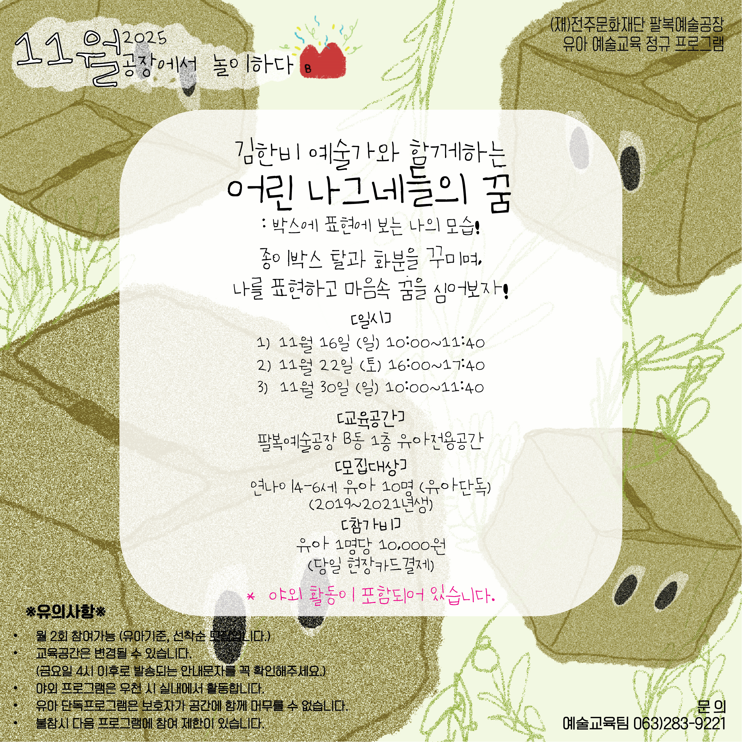 팔복예술공장 - 꿈꾸는예술터, 창작예술학교 11월 22일(토) 16:00-17:40 어린 나그네들의 꿈2-김한비*(유아 단독)아이 인원만 기재 | 공장에서놀이하다