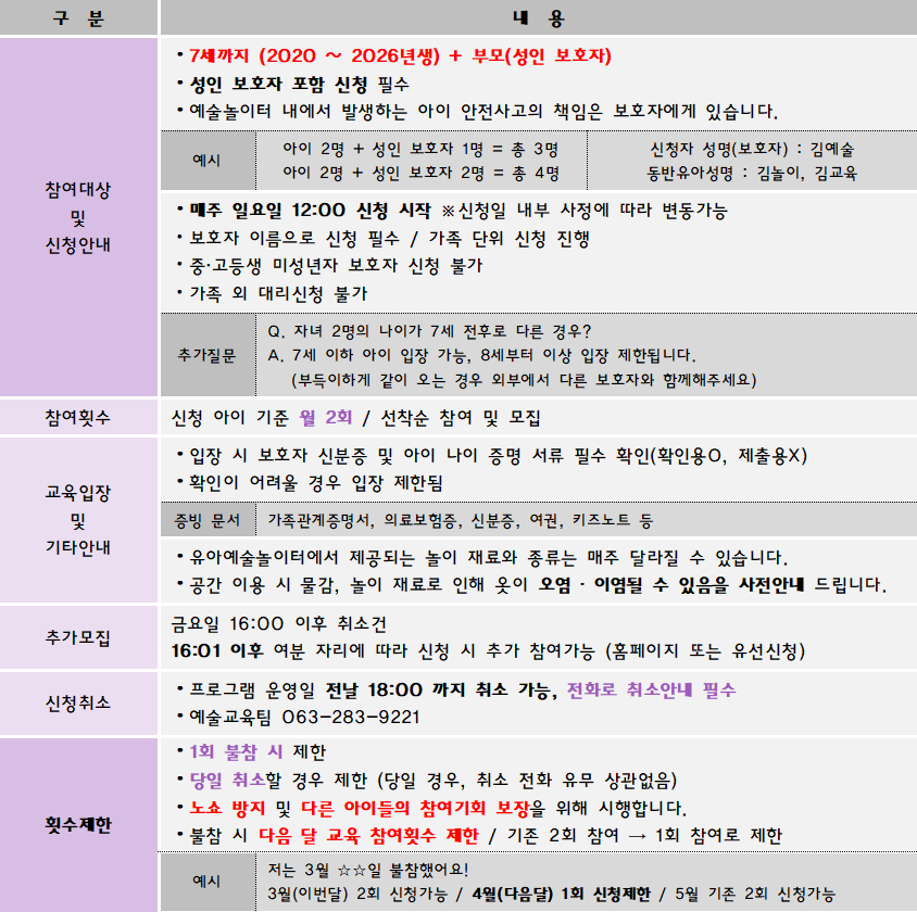 ※상설(유아예술놀이터) 과 정규(공장에서 놀이하다) 프로그램을 꼭 확인 후 신청해주세요